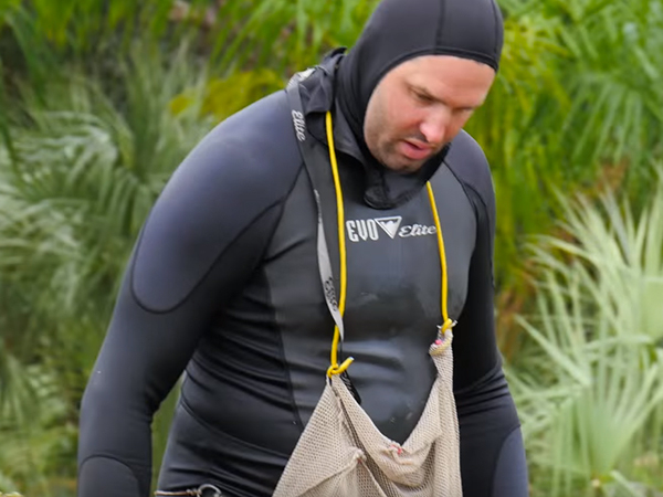 He straps on his scuba gear to get them balls at the bottom of a pool or lake.