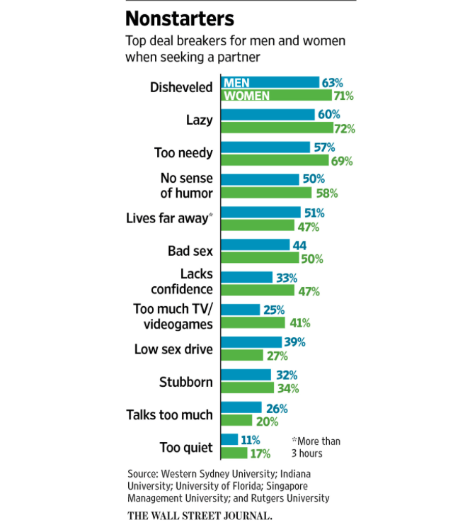 The Wall Street Journal did God’s work by researching the biggest deal breakers for men and women alike. The study was structured as follows:
