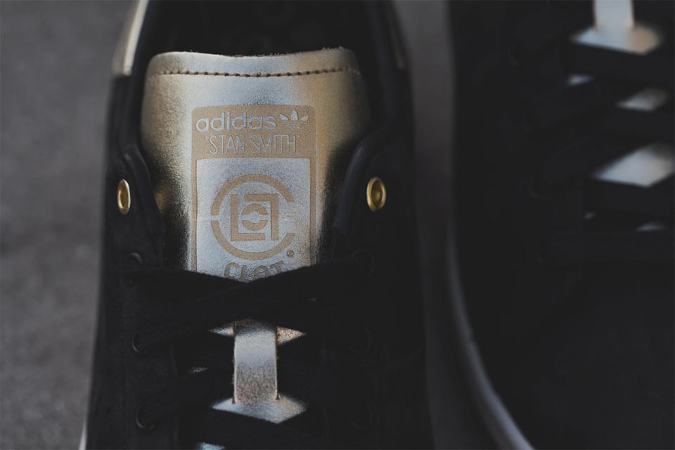 adidas Originals Stan Smith works together with Hong Kong based brand CLOt for a classic tennis sneaker release. Based on a black upper, the shoe has gold panels and subtle branding on the insoles and heel tab. Check out a few more pictures below: