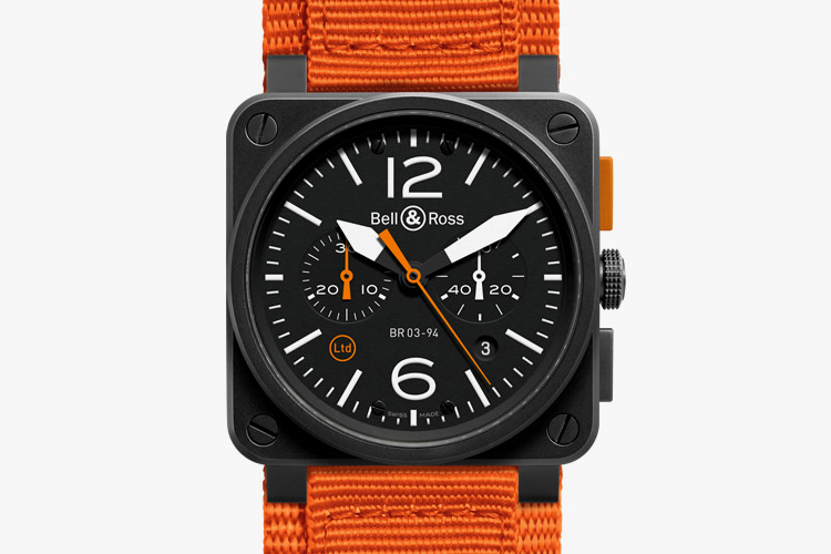 Bell & Ross’s BR 03-94 – is the smaller 42 mm aviation alternative to the 46 mm of the original BR-01. It got the limited edition treatment for Spring 2014 with a new "Carbon Orange" version of the easy to read chronograph, Expect the piece to be available soon at select Bell & Ross stockists.
