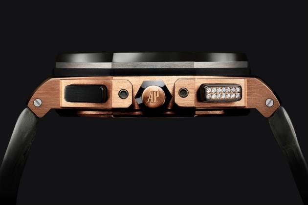 Here's a first look at the the Audemars Piguet Royal Oak Offshore Chronograph designed by LeBron James. Inspired by James’ powerful playing style, this limited edition watch features a 44mm pink gold case, brushed titanium bezel, a mega tapisserie dial with pink gold Arabic style numbers and a blue second hand. Finishing off the luxe look are 14 small diamonds set at the top pusher. Comes with a gray crocodile strap with gold hardware and a gray rubber strap. Limited to 600 pieces, priced at $51,500 USD.