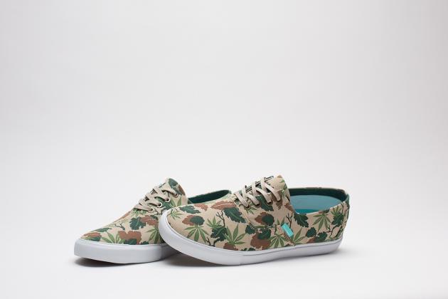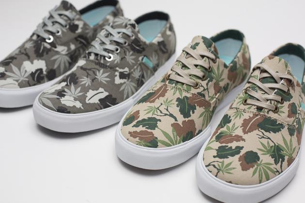 This is the latest from Diamond Supply Co.‘s Diamond Cuts low-top. The low profile vulcanized sole and custom molded PU footbed features 8 oz. canvas uppers complete with an all-over marijuana leaf camouflage motif.