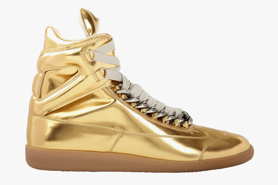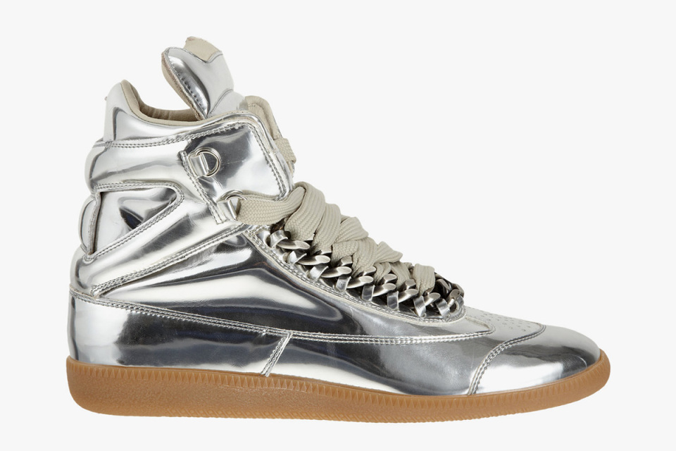 For Spring 2014, Maison Martin Margiela presents this luxurious take on the high-top chain sneaker. The metallic uppers feature gunmetal chain details around the lacing, finished off with a gum sole. Available in metallic silver and metallic gold, retails for $995 USD over at Barneys New York.